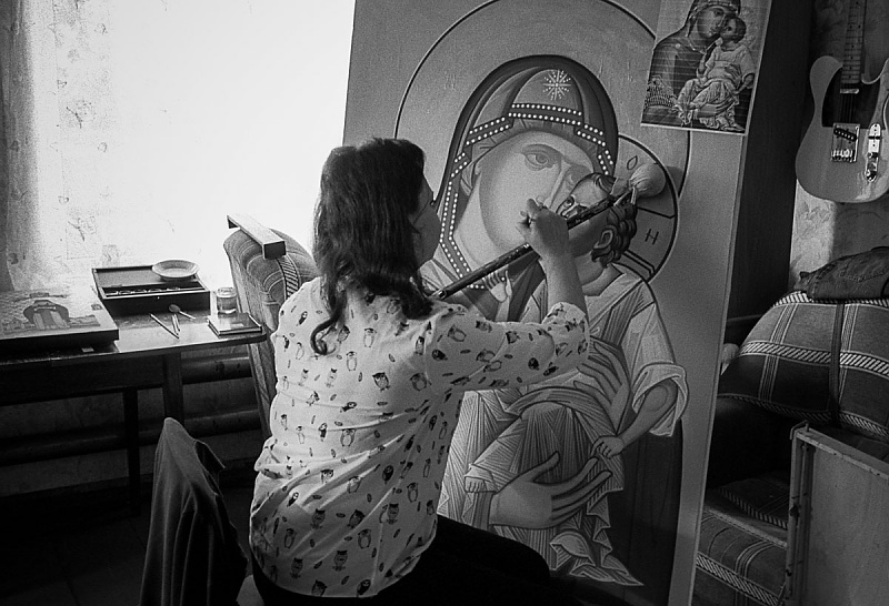 J'ai visité une petite ville au nom de Palekh connue dans le monde entier pour la production de ses icônes orthodoxes. Comme toute bourgade éloignée de la civilisation, sombrée dans la boue et la misère, on y trouve toutefois une très belle église du XVIe siècle, des magasins de souvenirs pour les pèlerins orthodoxes aux prix astronomiques et surtout des écoles de production d'icônes qui attirent les peintres de tout pays.