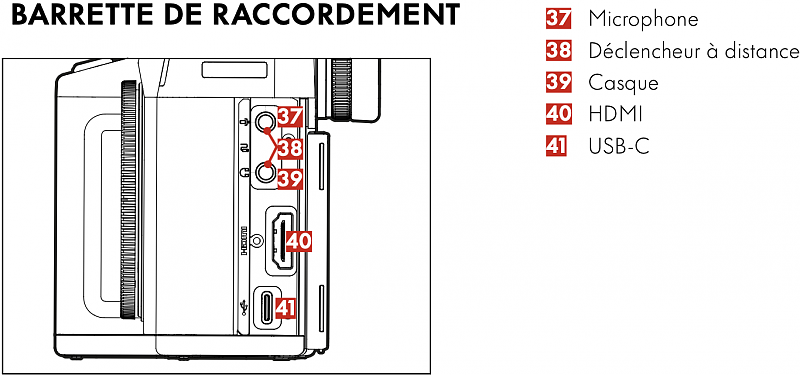 gautier a écrit : Ajout de la fiche technique, du mode d'emploi et du mode d'emploi succinct du Leica SL3-S.C'est en me renseignant sur la compatibilité des télécommandes que j'ai repéré cette version qui porte la même référence que la première. Dans la première version, je voyais ceci : ![]() Le port 38 pour "déclencheur à distance" ne ressemble pas à grand chose de connu. Des utilisateurs m'indiquaient que la télécommande du SL type 601 (dotée d'une prise spécifique, nécessitant de bricoler pour aller plus loin que le simple déclencheur, voir ici) n'était pas compatible mais que celle prévu pour les SL2 ou SL2-S (Leica 160066) convenait. Ce qui veut dire qu'on s'attend à un port jack. Par ailleurs, je vois ceci dans la notice succincte : ![]() Le port précédent est dessiné mais n'est plus légendé. Le "déclencheur à distance" semblant accepté par les ports 37 et 39 qui ressemblent bien à des jacks. Bizarre. J'ai alors regardé si les notices avaient évolué. Le mode d'emploi succinct semble inchangé. Mais le mode d'emploi complet a changé. La nouvelle version montre un schéma cohérent avec le modèle succinct : ![]() J'ai un peu cherché pour avoir autres choses que les images officielles Leica. Le port 38 est bouché en réalité. Leica a dû changer de système au dernier moment, sans changer les symboles imprimés. ![]() (recadrage d'une image de Jim Fisher) |