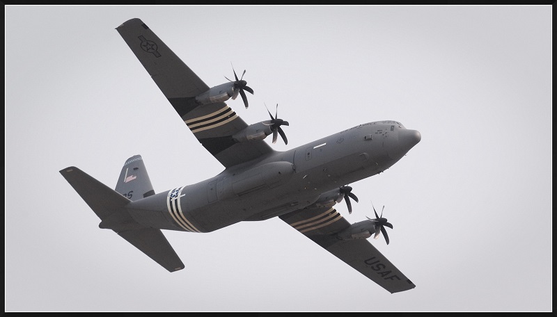 Impressionnant le C-130, et le ciel gris renforce le graphisme de l'image, les tons s'accordant bien ensemble, un monochrome couleur en quelque sorte. |